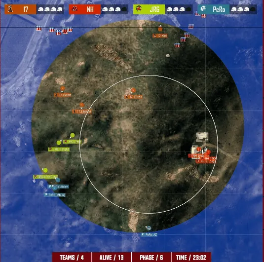 决赛圈,PeRo选择开车顶到JRG近点,PeRo和17夹击淘汰JRG,NH踩到高点,将PeRo最后一人淘汰。最终决赛圈NH与17四打四,双方利用道具和枪线拉扯互换两人,xwudd出枪打倒一人后,两人压上淘汰最后一人成功吃鸡。